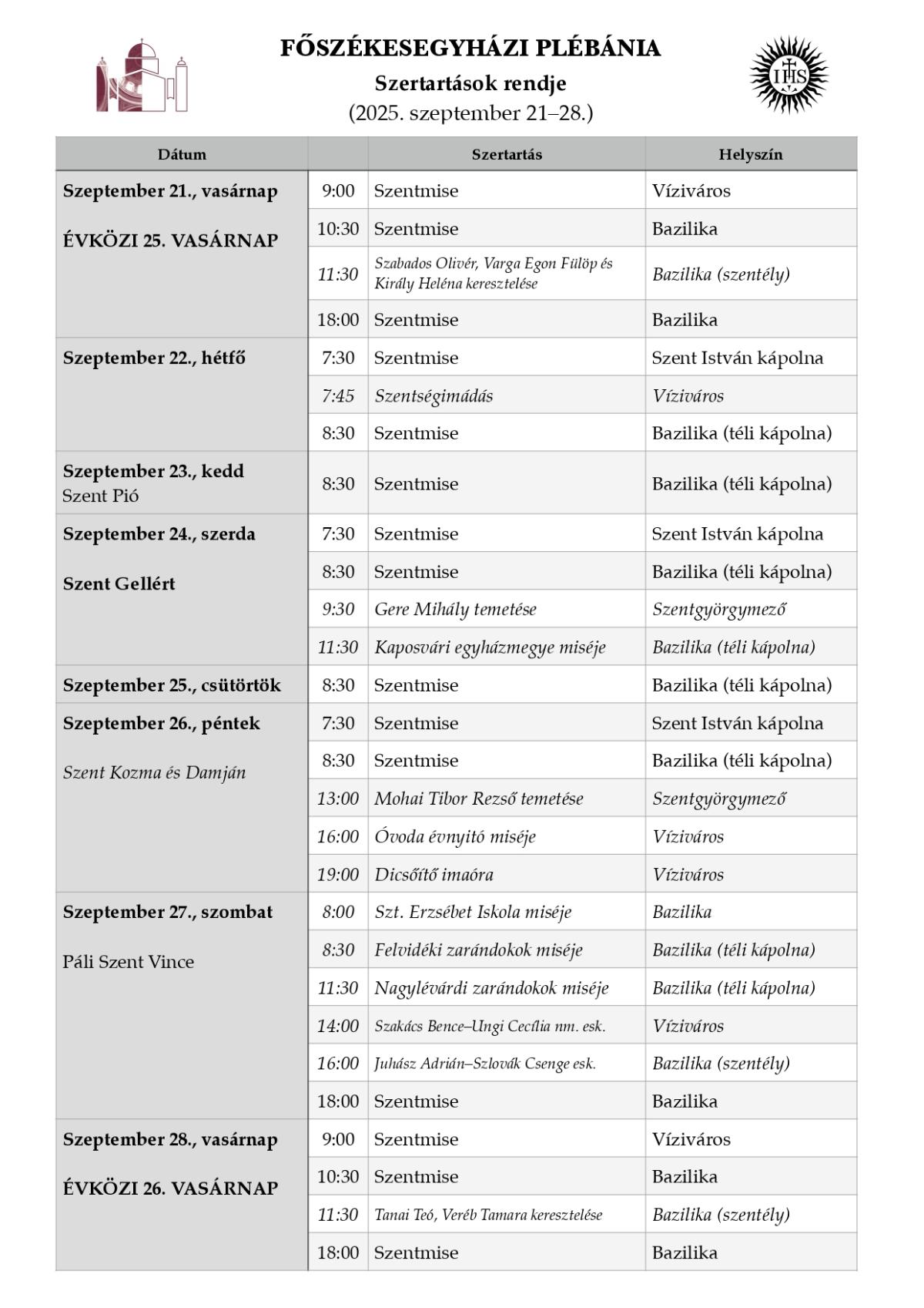 Szentmisék rendje